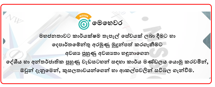 Postal Head Quarters,No 310, D.R.Wijewardena Maawatha,,Colombo 01000. TP:-+94 (11) 2470540| Fax:+94 (11) 2470539
