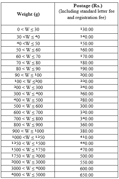 - This postage and registration fee should be paid in advance and should be paid by affixing a stamp on the front of the item.